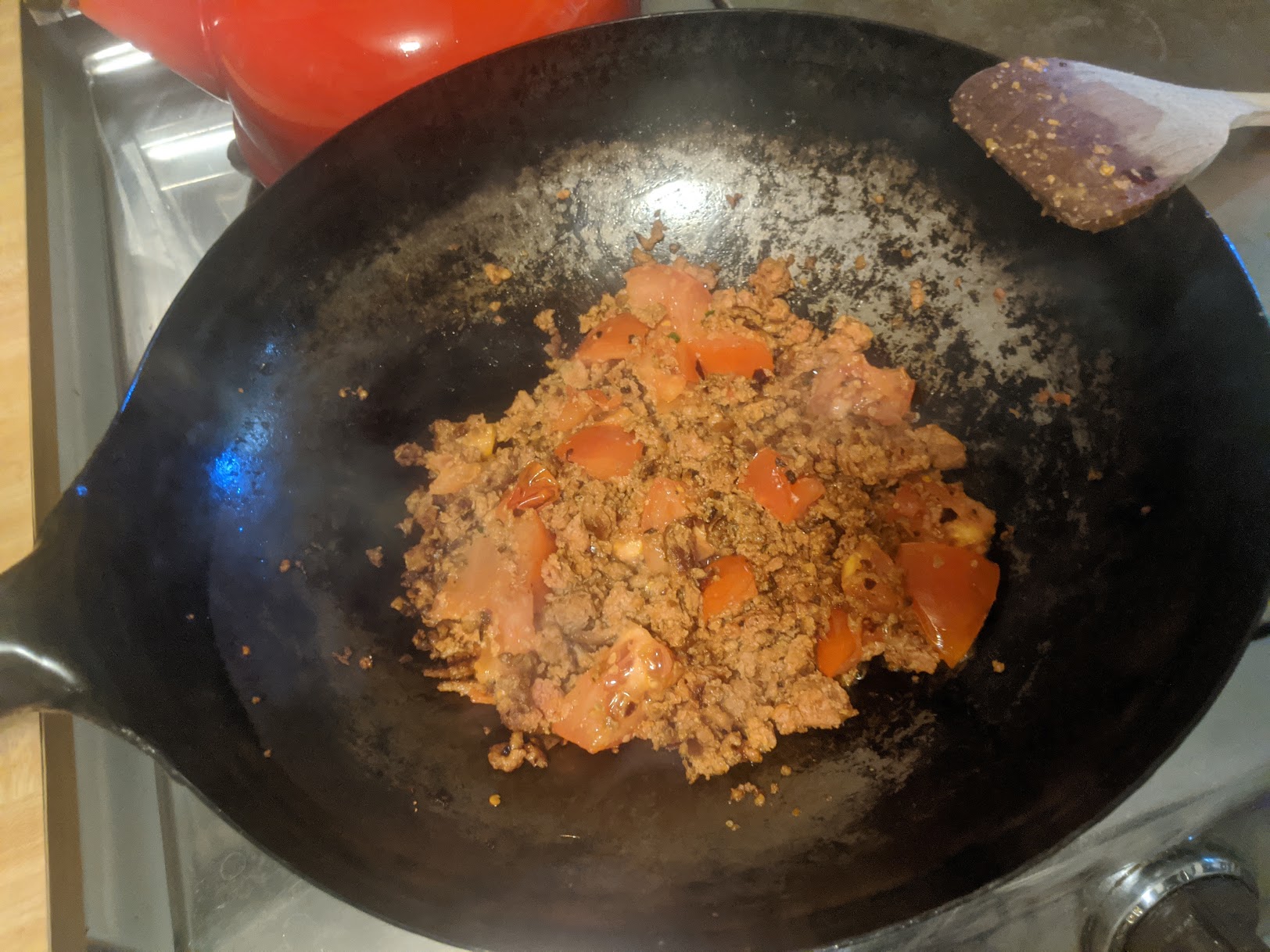 In my wok I melted 2 T of butter and added one package (still half frozen) of Awesome Grounds. As it started to sizzle I added 2 T granulated Gilroy Garlic, 1 T onion powder, 3 T of my 2019 Holiday Wester-style BBQ Rub and 1/4 tsp black pepper. Once the bottom of the brick of grounds started to brown, using a wooden spoon I broke the grounds up and stirred through the spices. After about 8 minutes of stirring and breaking the grounds into smaller and smaller crumbles I added one coarsely chopped beef steak tomato and stirred it through until it "melted" into the mixture. Then I heated up the cast iron skillet and toasted the tortillas.