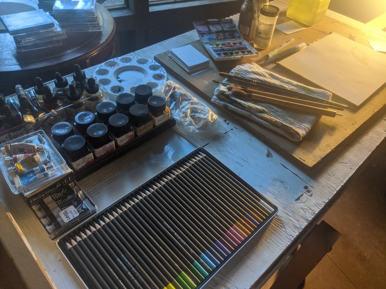 But I digress...Palace Art usually doesn't have what I'm looking for anyway. Yesterday was no exception. It's a hobby shop at best. So I headed over to Lenz. It's a cramped space but a better Art supply store in general. I got some really nice paper for this year's work plus some pigments and medium I needed. New supplies are always exciting. The thrill of potential is almost intoxicating. So later today I will embark upon more materials tests. It's kinda like artist calisthenics.