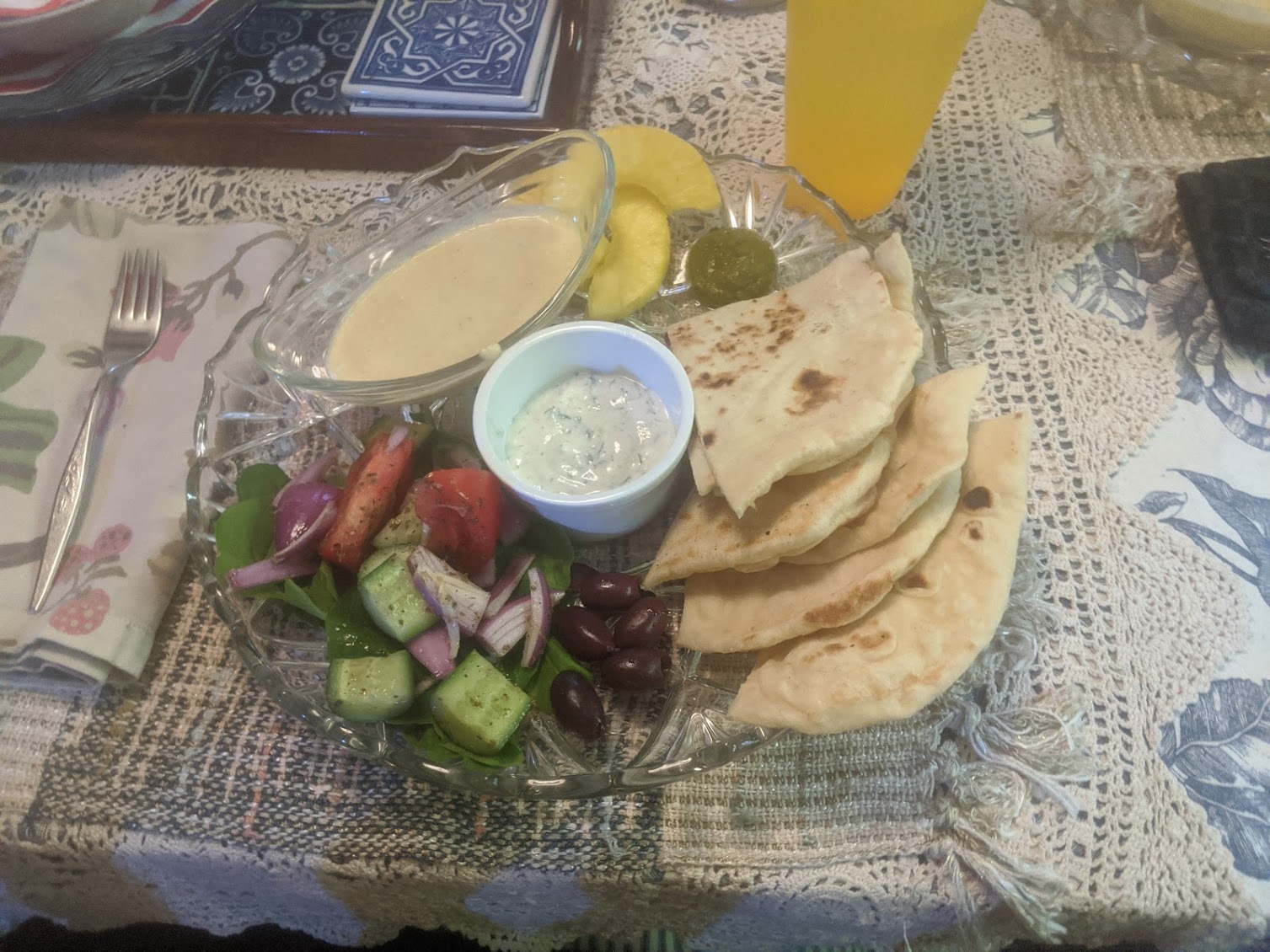 It's Monday so that meant it was bread baking day on TKPR. This week I've opted to make flat bread instead of sandwich loaves. Used a couple fresh pieces to accompany today's lunch mezza. It's exciting to be able to start harvesting small items like arugula, amaranth greens, nasturtium leaves and herbs from the garden. And in a couple years we're sure to have more than enough olives to cure. Who doesn't like mezza? Lunatics with no taste...that's who. Today's mezza included home made hummus, fresh salad, pineapple slices, kalamata olives, herbed yogurt dip and of course, the star of the plate...the bread.