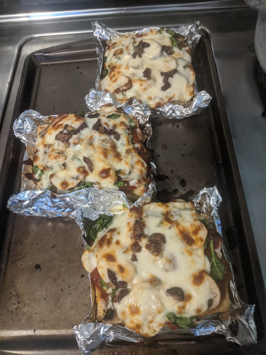 The cous-cous was nice with the stewed collard greens and the chick pea fritters with the yogurt sauce was divine. I've made a few different styles of flat bread over the years, but I think I have finally perfected my personal style of flat bread using a combination of wheat flour and spelt flour. Omar is quite pleased as well. Bread baking is an interesting science. I also have been working on perfecting my sandwich bread techniques. These were particularly nice French-bread-style veggie pizzas I made last week using my sandwich bread: