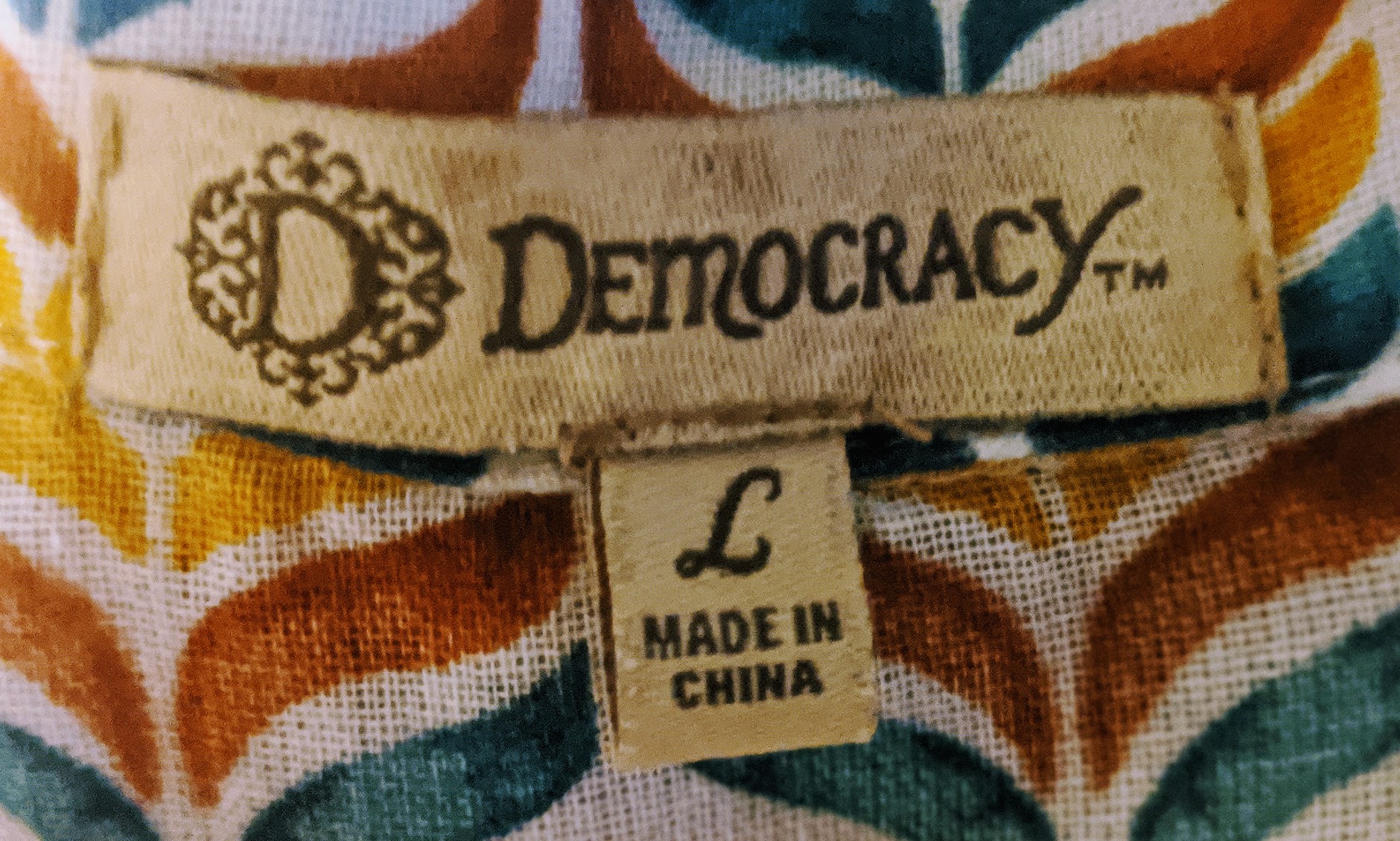 It struck me as Omar and I sat looking at all of the works lined up next to each other how interesting it was that I had chosen this subject matter to look at this year way back in late September or early October of last year. And now...here we all are, holed up in our homes being jailed by threat of a tiny virus. Then this morning I was struck by another very ironic image from every day life. I recycle and up-cycle a lot of textiles as my personal practice. This includes buying a lot of my clothing second hand. It's better for the environment. As I took one such piece out of my closet this morning and laid it on the bed for when I got out of the shower I had to take a picture of what I saw: